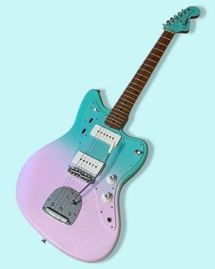 Comfortable offset waist design, extra nice when sitting down, but ergonomic standing up. Buckets of tone on offer with the rhythm circuit and other options for wiring and components. The rocking bridge and sensitive offset vibrato setup is always a joy to play, particularly when doing Kevin Shields style "glide" vibrato when strumming.